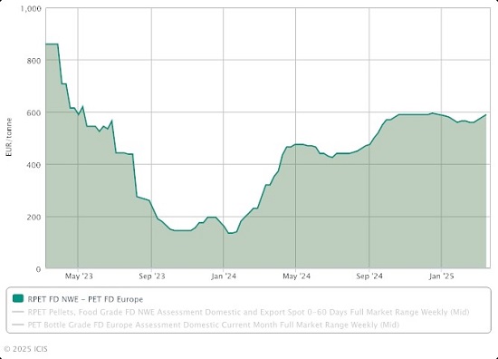 Since cost-cutting is still crucial in 2025, several firms are reducing the usage of recycled content due to spreads of about €600/ton between virgin PET, food-grade pellet (FGP), and recycled polyethylene terephthalate (R-PET).